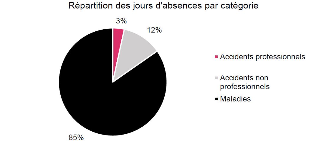 On constate donc que la maladie constitue la principale cause d’absentéisme (85%) avec 216’775 jours d’absence en 2023. Les 3% d’absence pour accidents professionnels représentent 8’762 jours et les accidents non-professionnels représentent 30’293 jours.